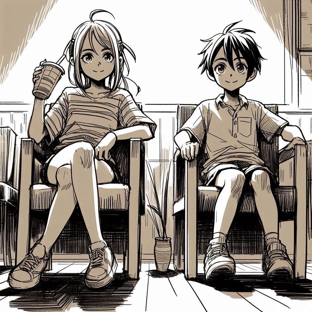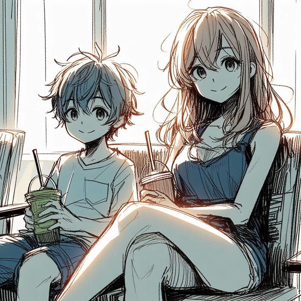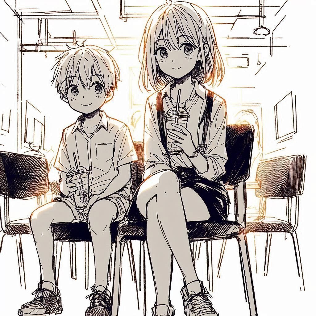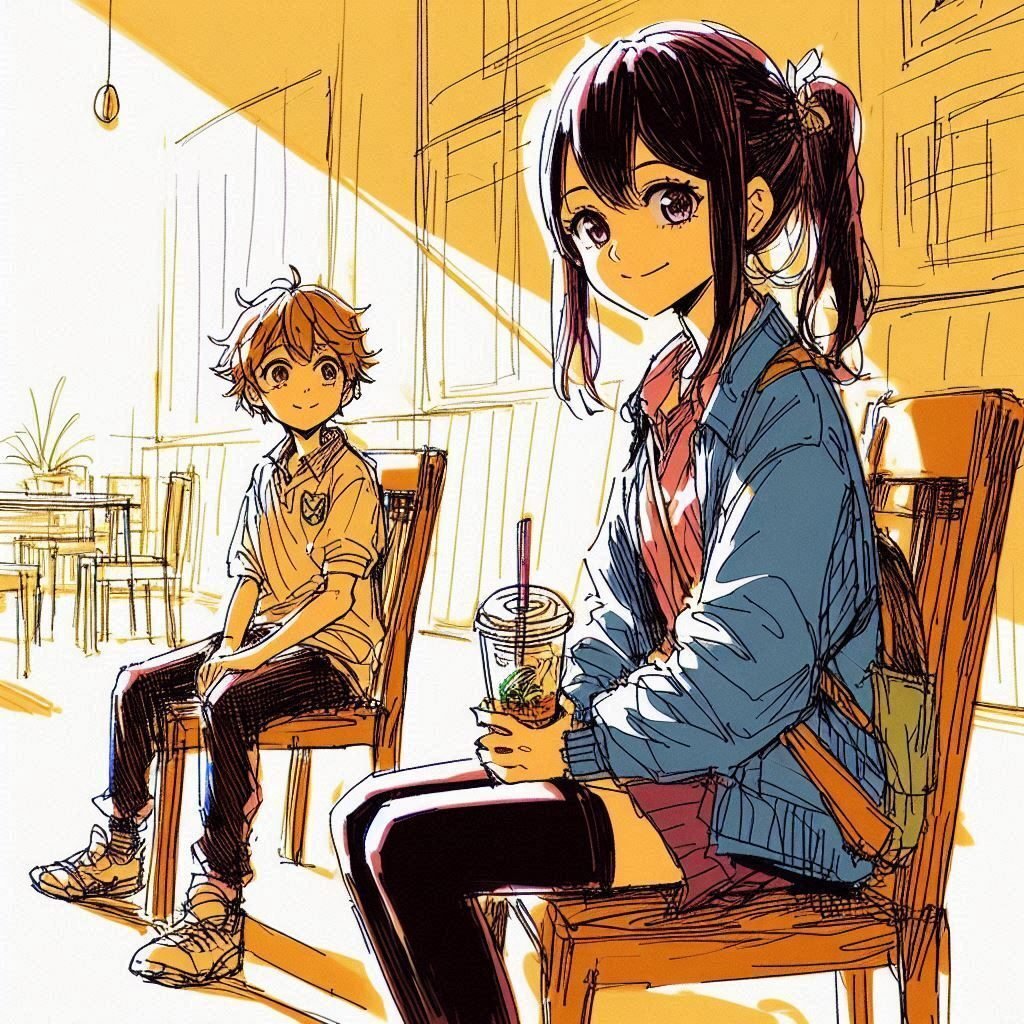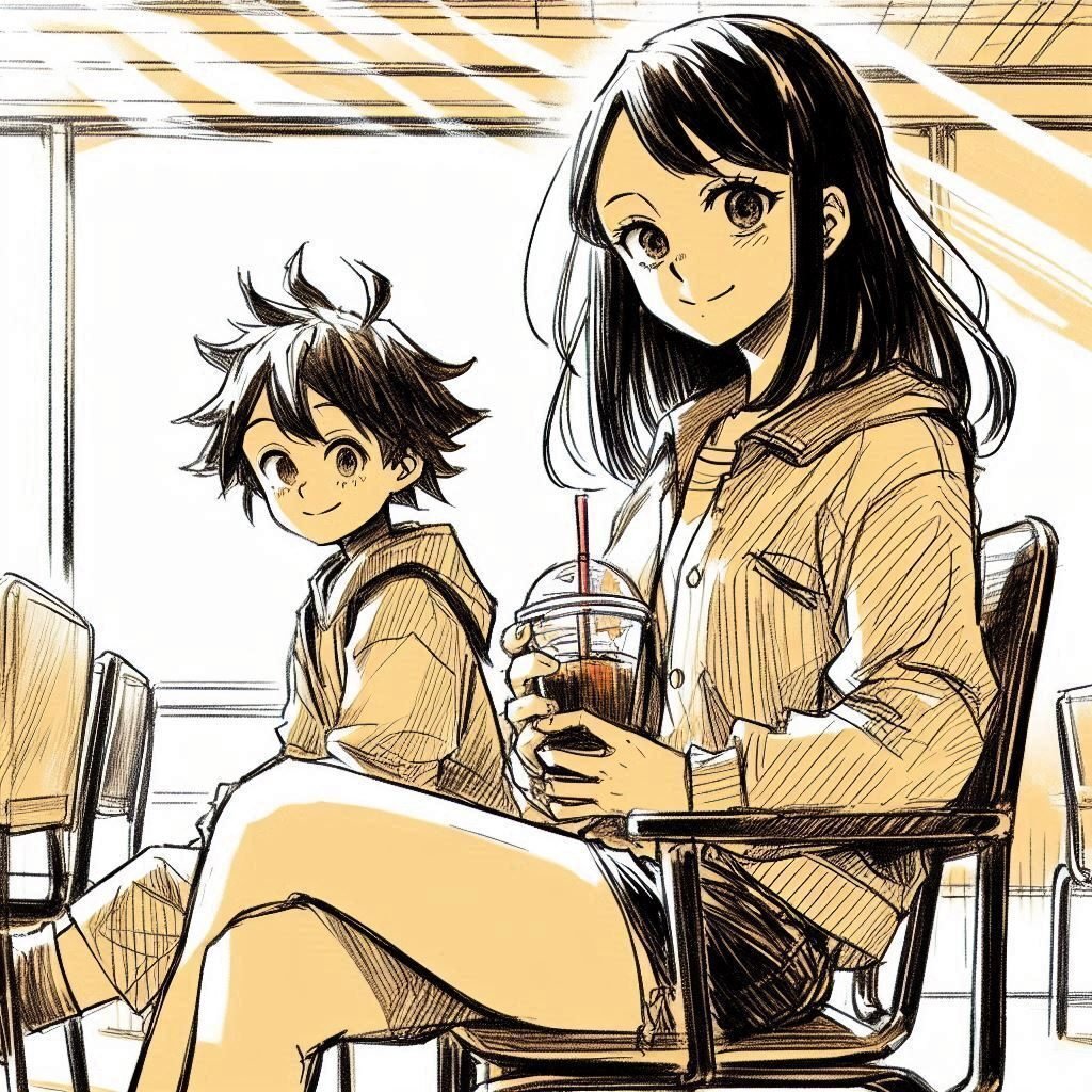 A very simple, rough, stylized manga-style sketch illustration of a 15-year-old girl and a younger boy, around 7 years old, sitting on chairs indoors with natural expressions in a backlit setting. The girl is holding a drink, looking at the camera with a relaxed smile, while the boy, sitting next to her, is also holding a drink with a calm and friendly expression. The background includes a simple indoor setting. The style is very rough and sketchy, with vibrant colors