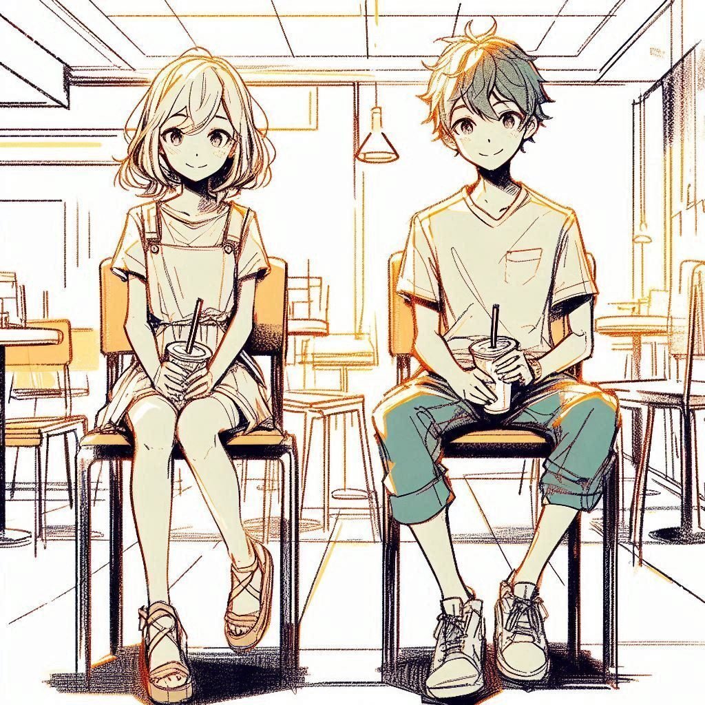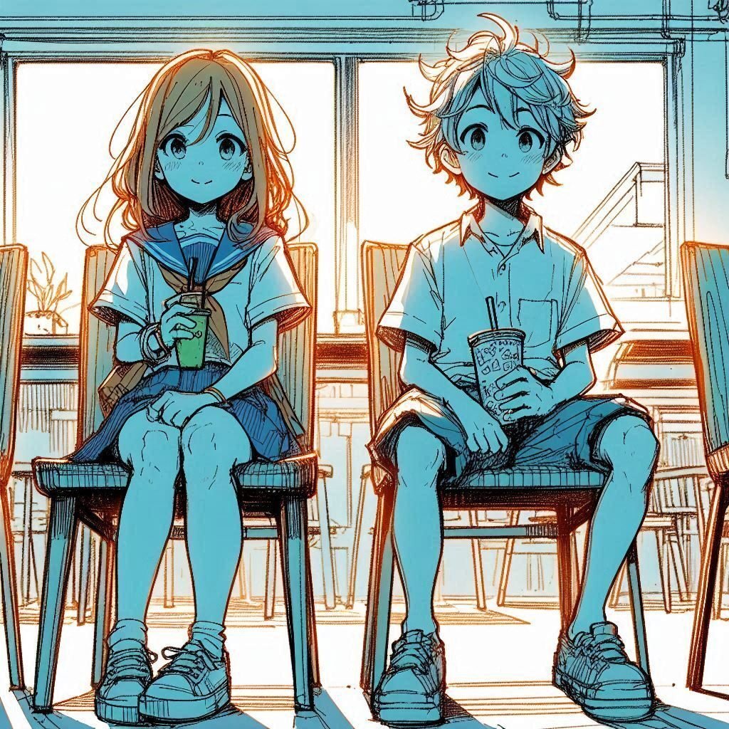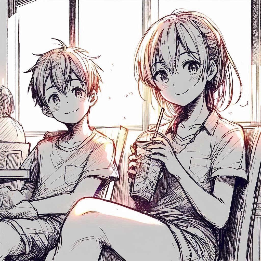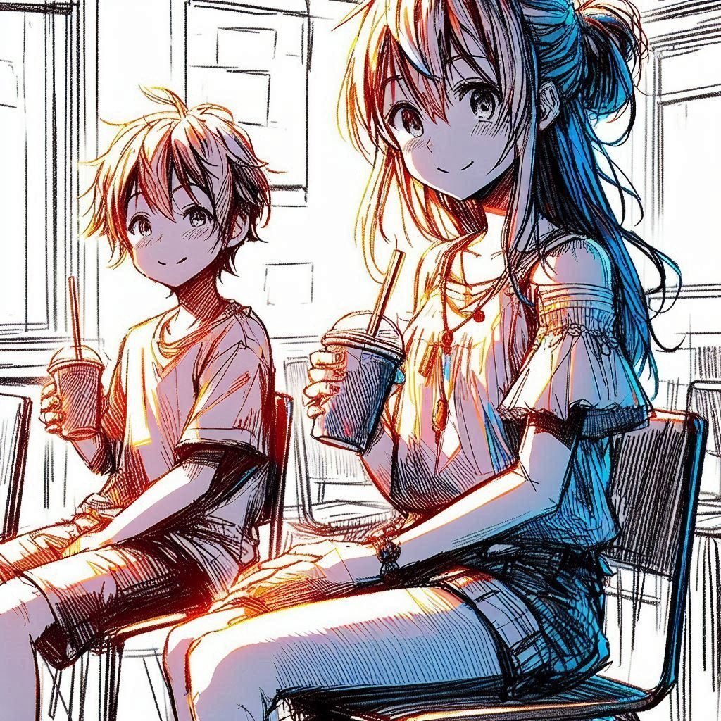 A very simple, rough, stylized manga-style sketch illustration of a 15-year-old girl and a younger boy, around 7 years old, sitting on chairs indoors with natural expressions in a backlit setting. The girl is holding a drink, looking at the camera with a relaxed smile, while the boy, sitting next to her, is also holding a drink with a calm and friendly expression. The background includes a simple indoor setting. The style is very rough and sketchy, with vibrant colors