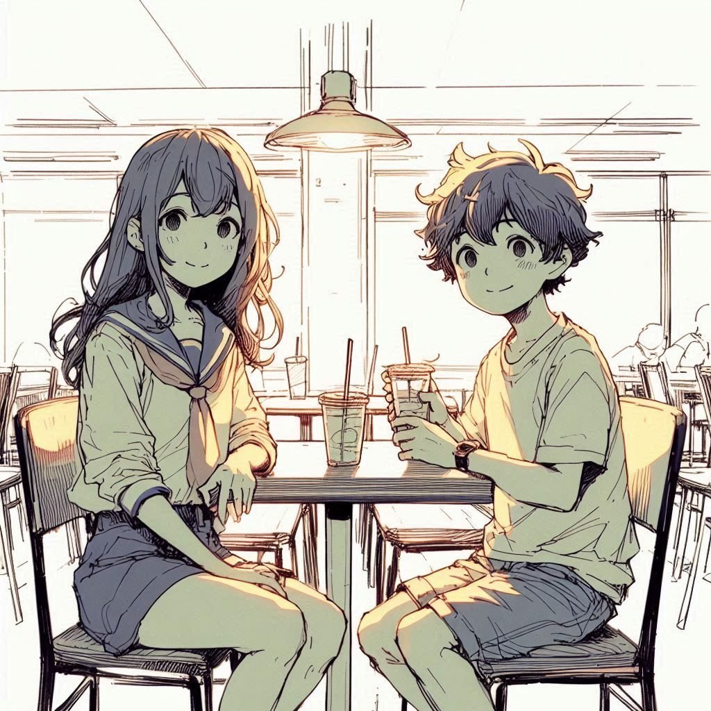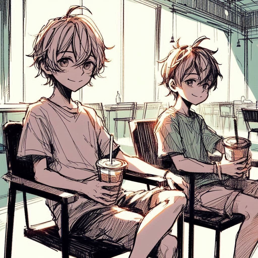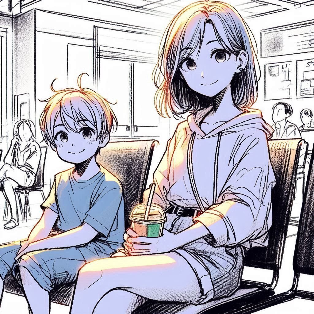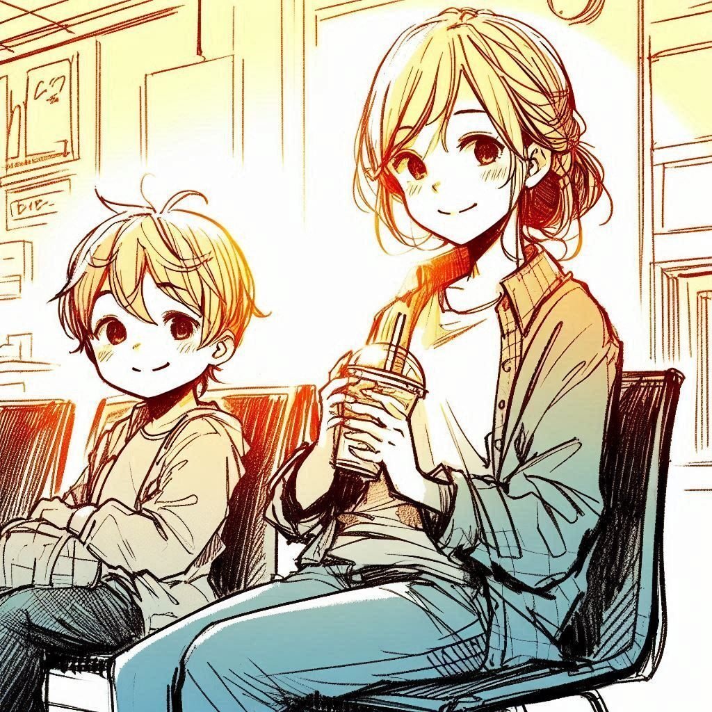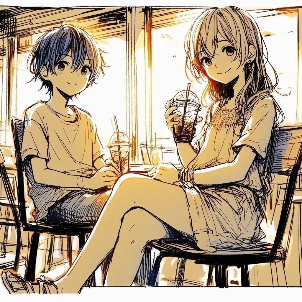 A very simple, rough, stylized manga-style sketch illustration of a 15-year-old girl and a younger boy, around 7 years old, sitting on chairs indoors with natural expressions in a backlit setting. The girl is holding a drink, looking at the camera with a relaxed smile, while the boy, sitting next to her, is also holding a drink with a calm and friendly expression. The background includes a simple indoor setting. The style is very rough and sketchy, with vibrant colors