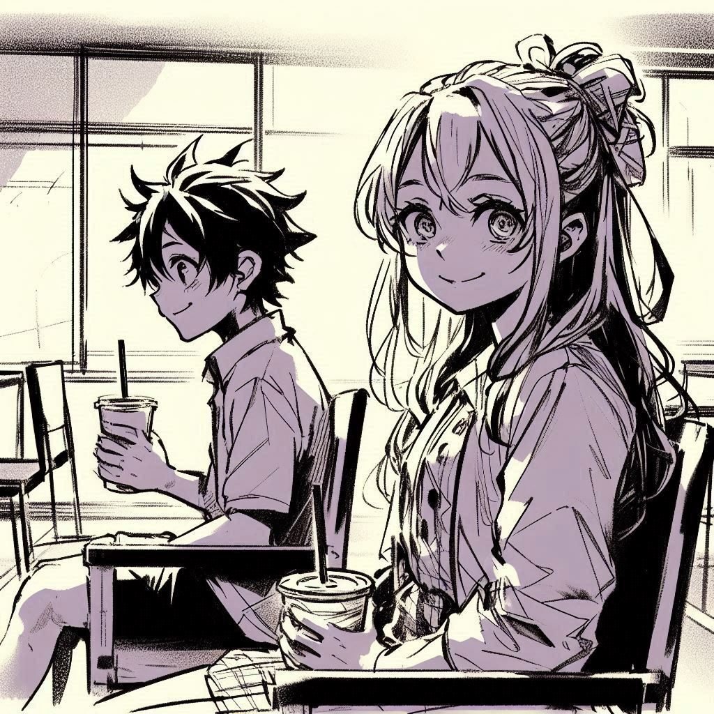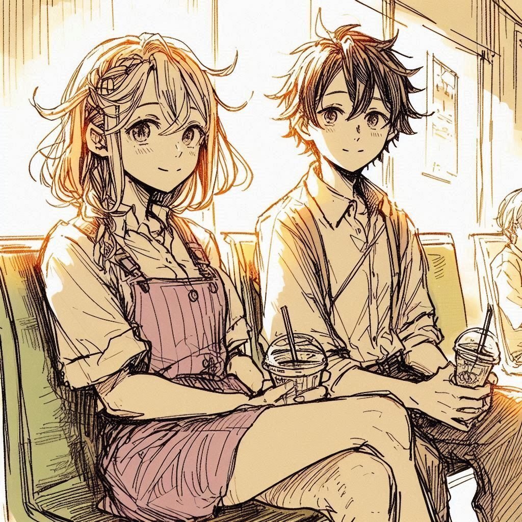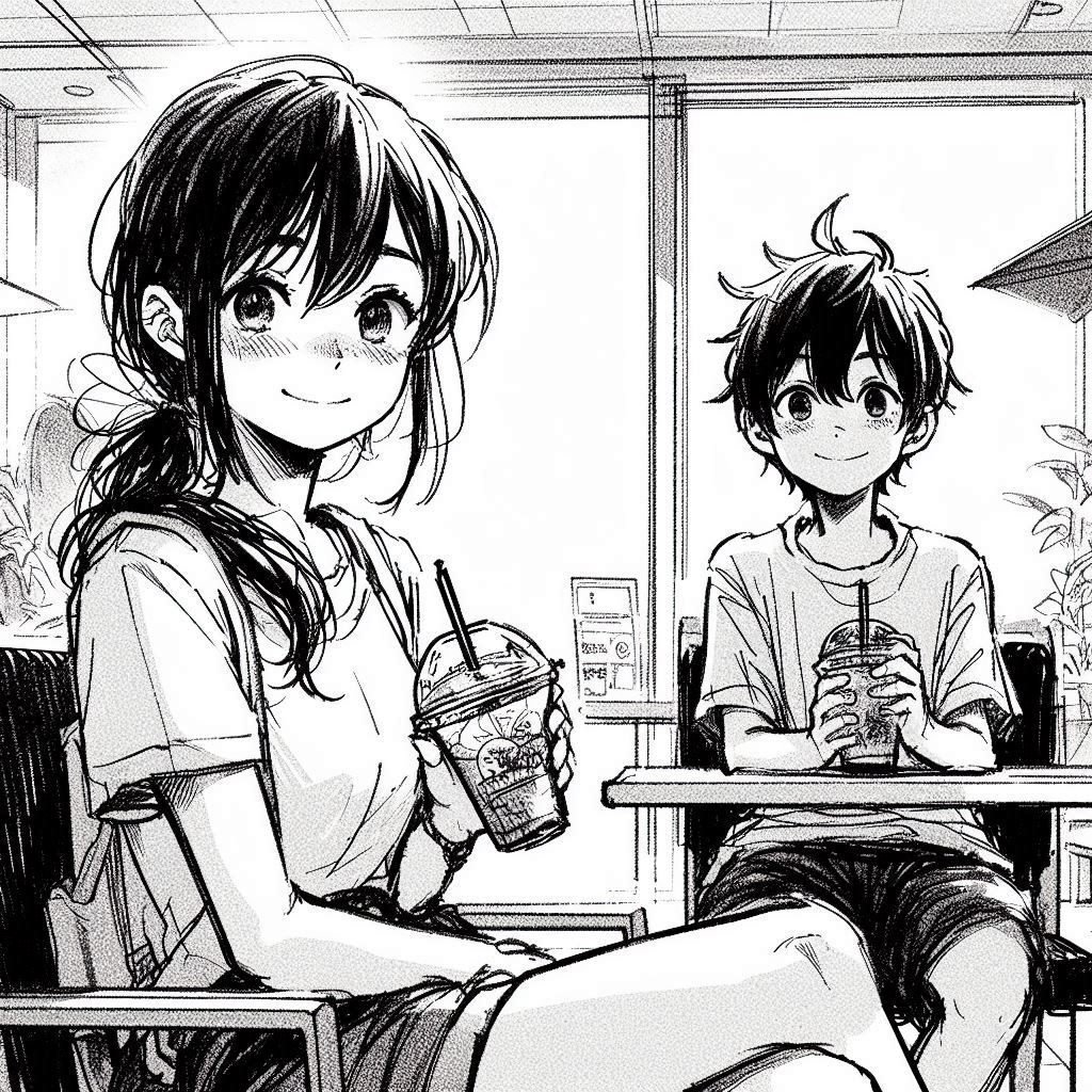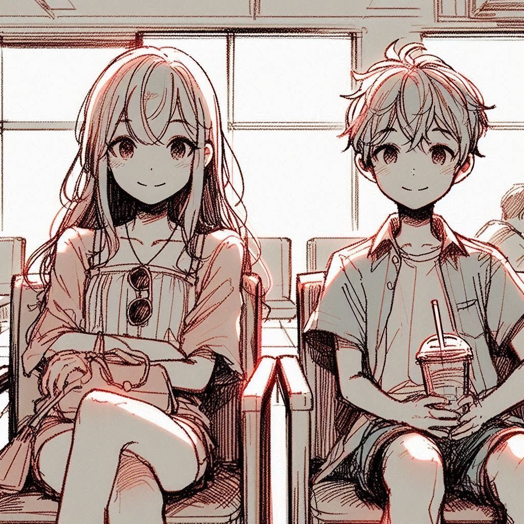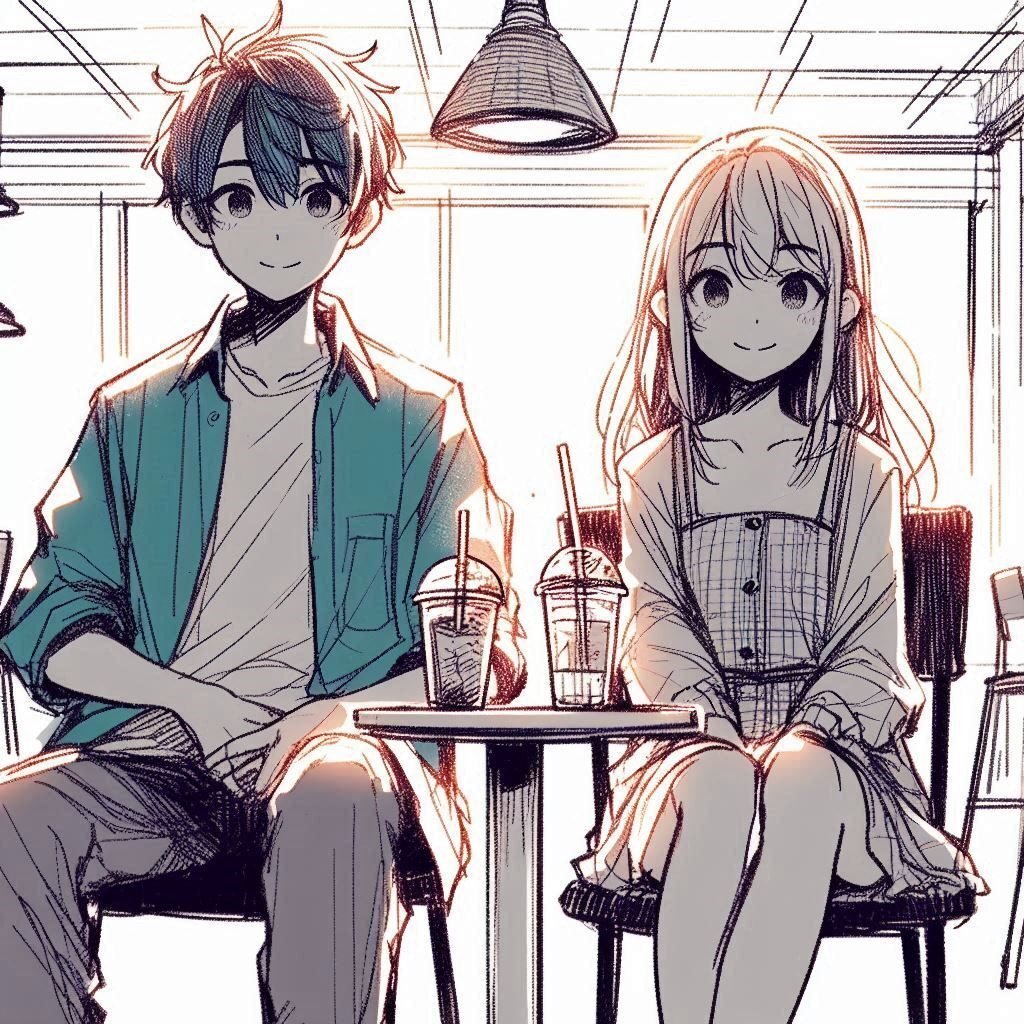 A very simple, rough, stylized manga-style sketch illustration of a 15-year-old girl and a younger boy, around 7 years old, sitting on chairs indoors with natural expressions in a backlit setting. The girl is holding a drink, looking at the camera with a relaxed smile, while the boy, sitting next to her, is also holding a drink with a calm and friendly expression. The background includes a simple indoor setting. The style is very rough and sketchy, with vibrant colors